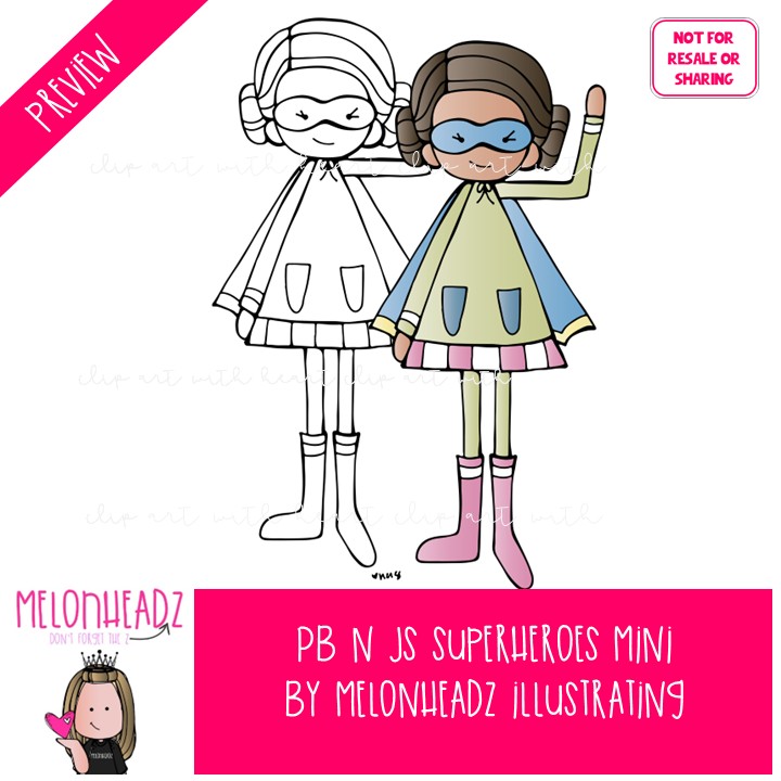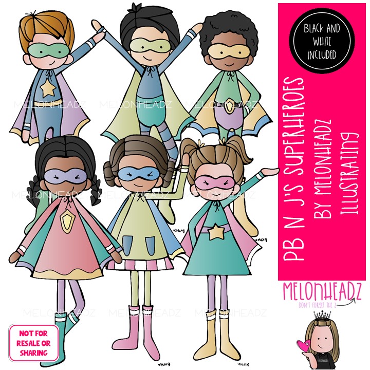 PB n Js’ clip art, Superheroes Mini: This illustrated set contains all of the clip art images as shown in the preview picture. COLORED and BLACK AND WHITE illustrations included.