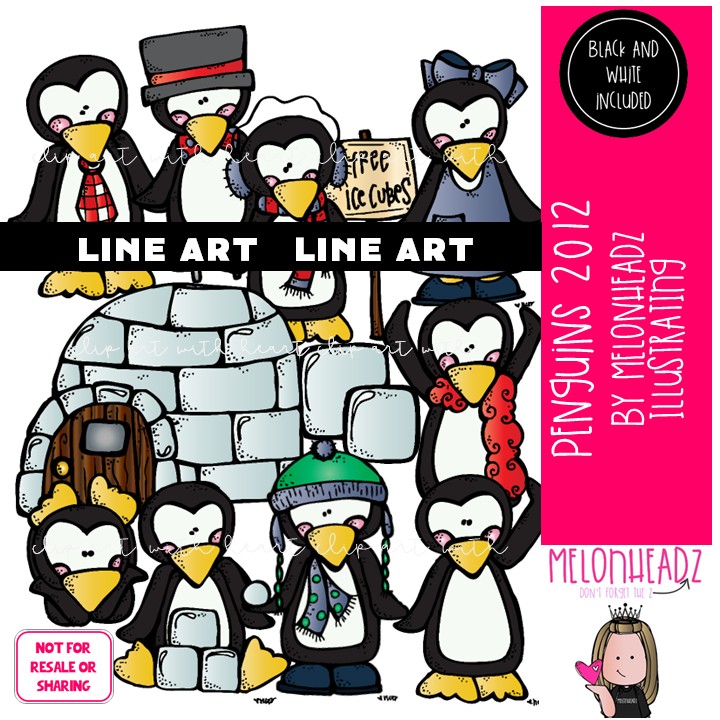 Penguins clip art, Winter clip art LINE ART and BLACK AND WHITE: This illustrated set contains all of the clip art images as shown in the preview picture. LINE ART and BLACK AND WHITE illustrations included.