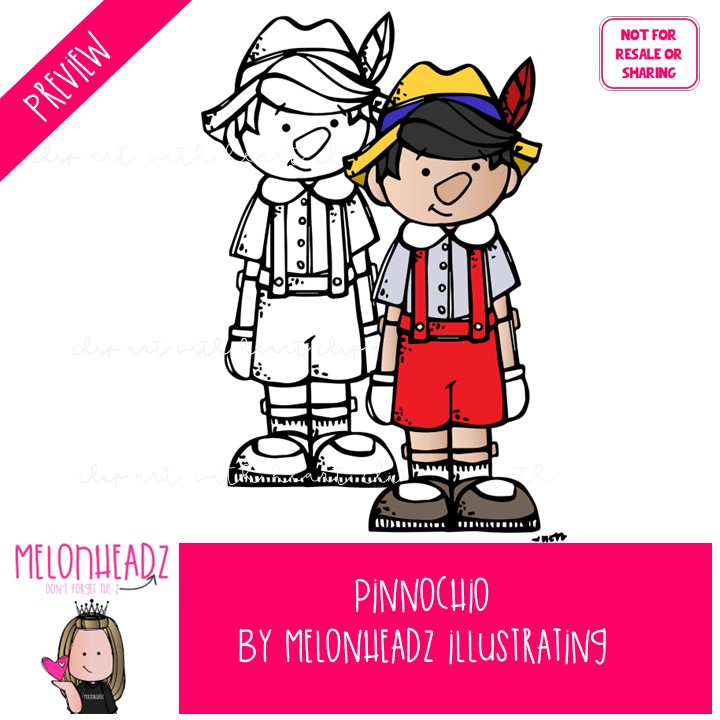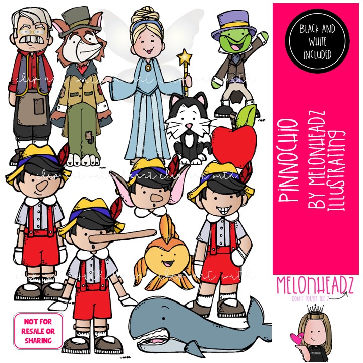 Pinocchio clip art, literature, book companion COMBO PACK: This illustrated set contains all of the clip art images as shown in the preview picture. COLORED and BLACK AND WHITE illustrations included.