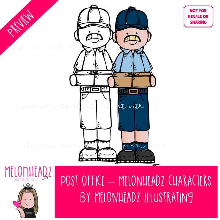 Post Office clip art, Melonheadz Characters Mini: This illustrated set contains all of the clip art images as shown in the preview picture. COLORED and BLACK AND WHITE illustrations included.