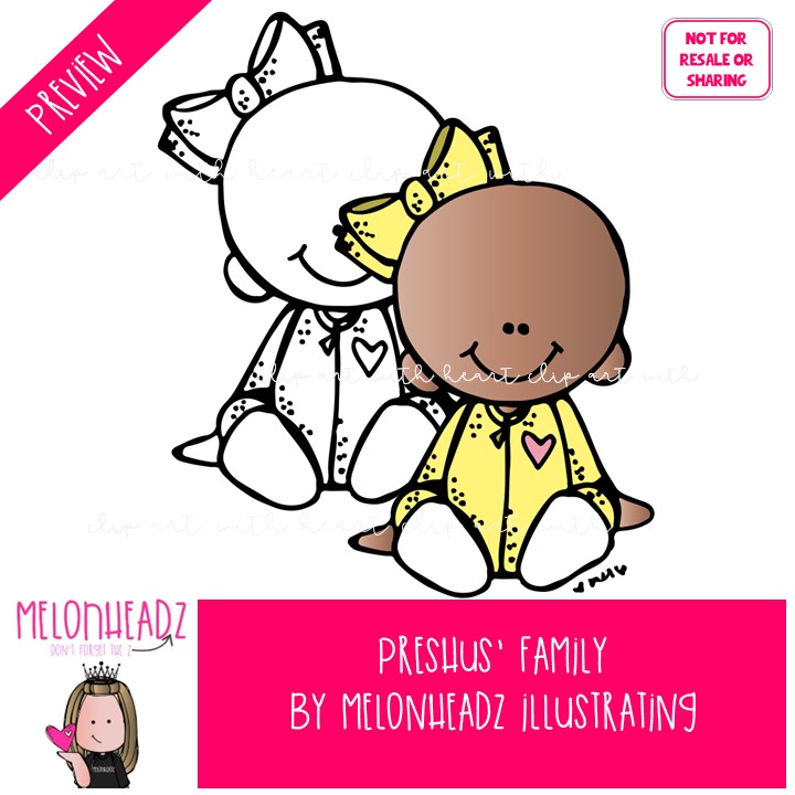 Preshus’ Family clip art, Melonheadz Character COMBO PACK: This illustrated set contains all of the clip art images as shown in the preview picture. COLORED and BLACK AND WHITE illustrations included.