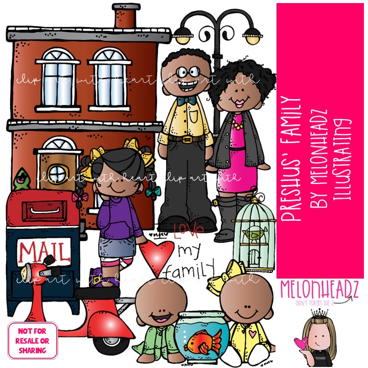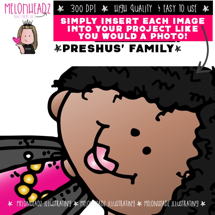 Preshus’ Family clip art, Melonheadz Character COLORED Version: This illustrated set contains all of the clip art images as shown in the preview picture. COLORED illustrations included.