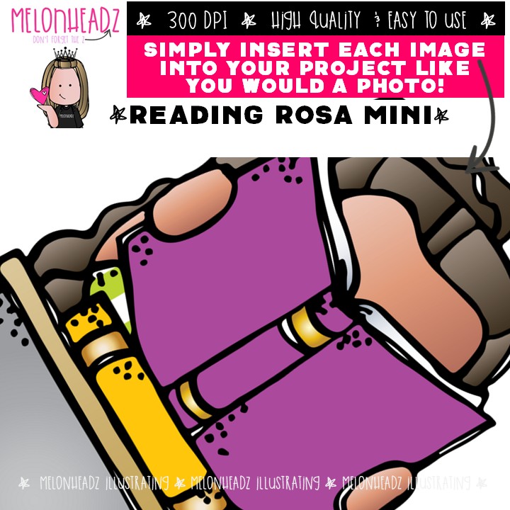 Reading clip art, Rosa, Melonheadz Character Mini: This illustrated set contains all of the clip art images as shown in the preview picture. COLORED and BLACK AND WHITE illustrations included.