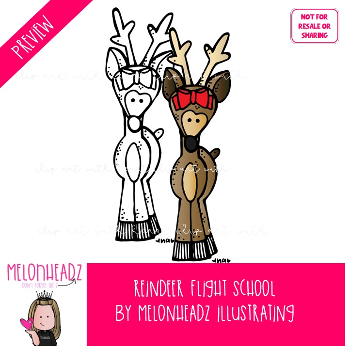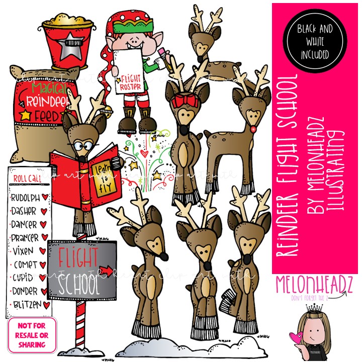 Reindeer flight school clip art, Christmas clip art COMBO PACK: This illustrated set contains all of the clip art images as shown in the preview picture. COLORED and BLACK AND WHITE  illustrations included.
