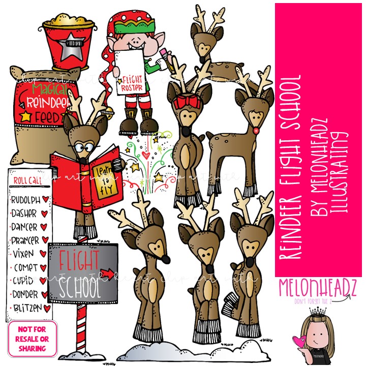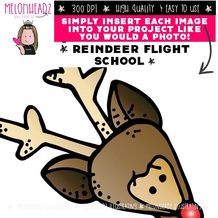 Reindeer flight school clip art, Christmas clip art COLORED Version: This illustrated set contains all of the clip art images as shown in the preview picture. COLORED illustrations included.
