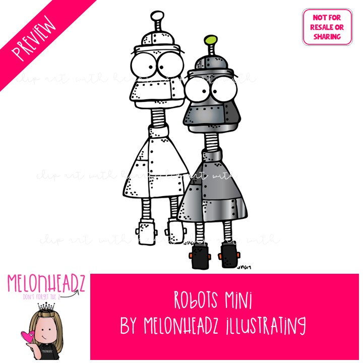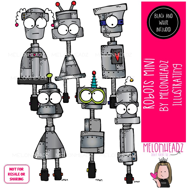 Robots clip art, Machine clip art Mini: This illustrated set contains all of the clip art images as shown in the preview picture. COLORED and BLACK AND WHITE  illustrations included.