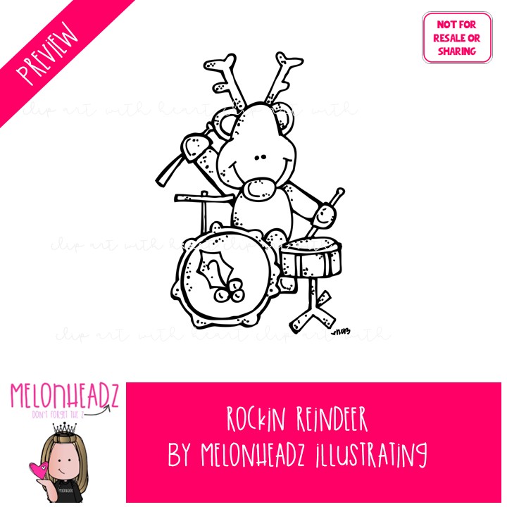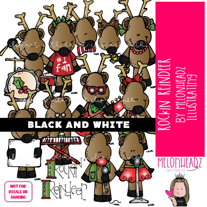 Rockin Reindeer clip art, Christmas clip art BLACK AND WHITE: This illustrated set contains all of the clip art images as shown in the preview picture. BLACK AND WHITE illustrations included.