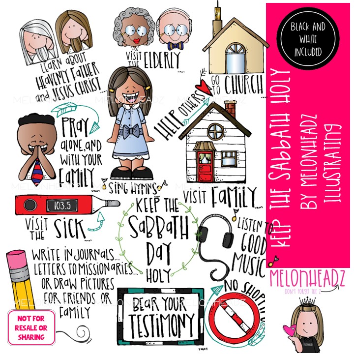 Keep the Sabbath Day Holy clip art, LDS COLORED Version: This illustrated set contains all of the clip art images as shown in the preview picture. COLORED and BLACK AND WHITE illustrations included.