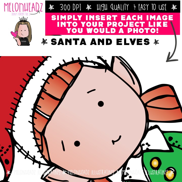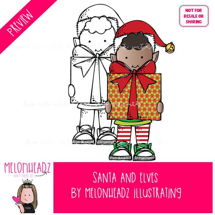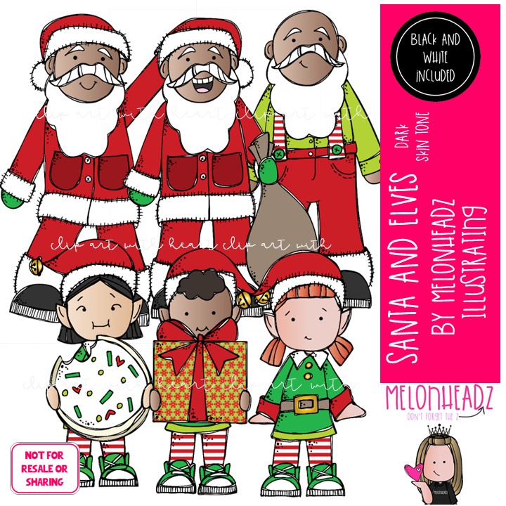 Santa and Elf clip art dark skin tone, Christmas clip art Mini: This illustrated set contains all of the clip art images as shown in the preview picture. COLORED and BLACK AND WHITE  illustrations included.