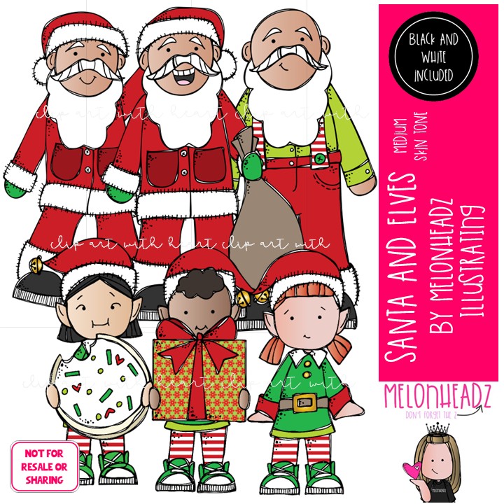 Santa and Elf clip art medium skin tone, Christmas clip art Mini: This illustrated set contains all of the clip art images as shown in the preview picture. COLORED and BLACK AND WHITE illustrations included.