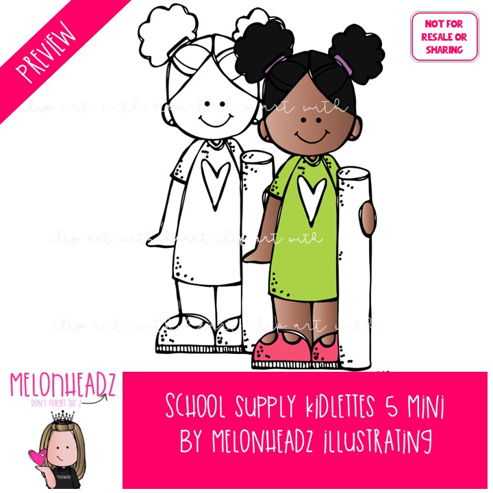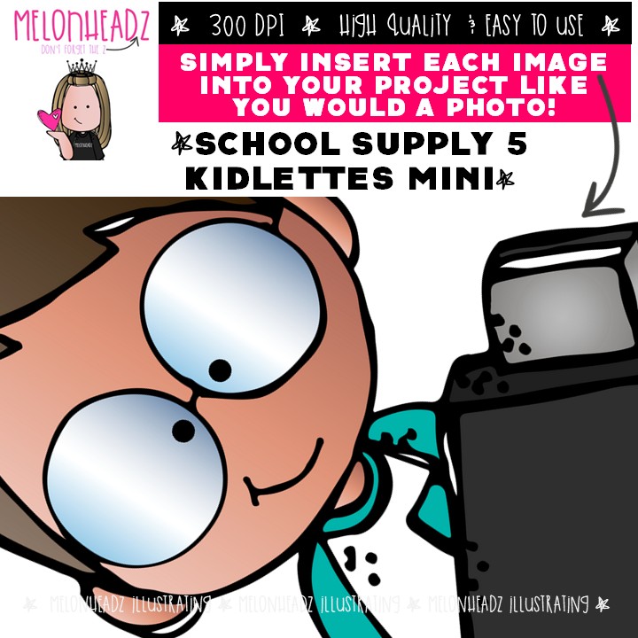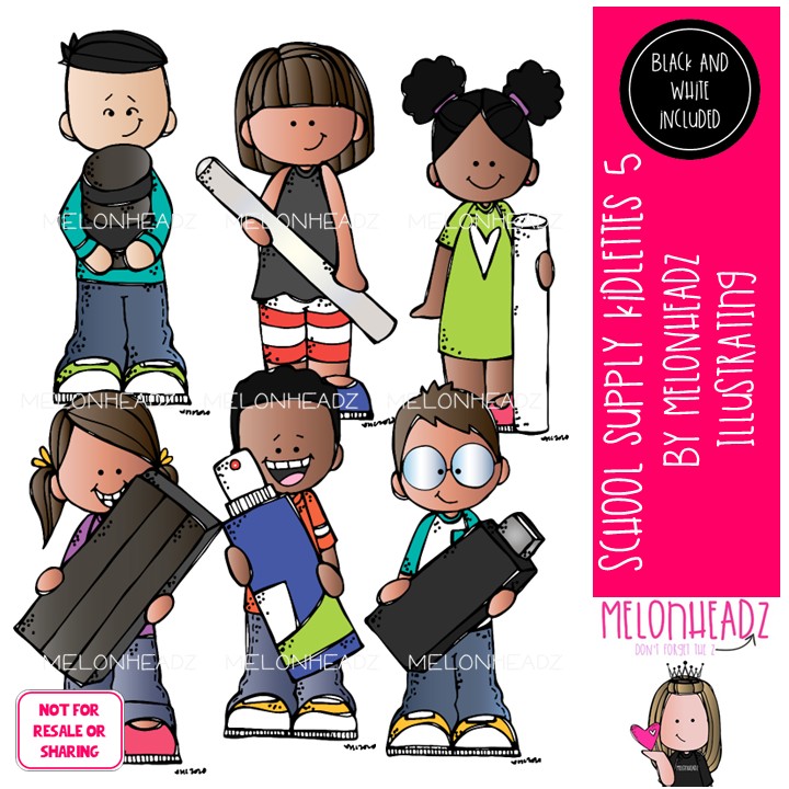School Supply 5 Kidlettes clip art, office supplies Mini: This illustrated set contains all of the clip art images as shown in the preview picture. COLORED and BLACK AND WHITE illustrations included.