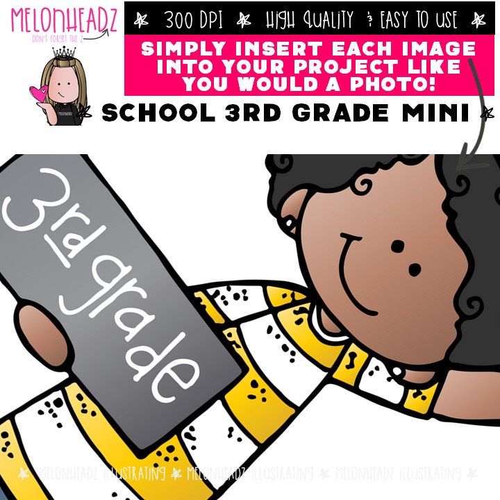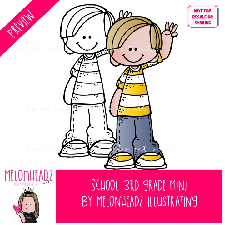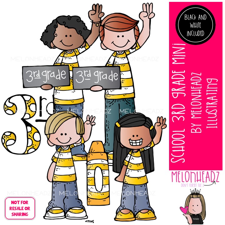 School clip art, 3rd (third) grade Mini: This illustrated set contains all of the clip art images as shown in the preview picture. COLORED and BLACK AND WHITE illustrations included.