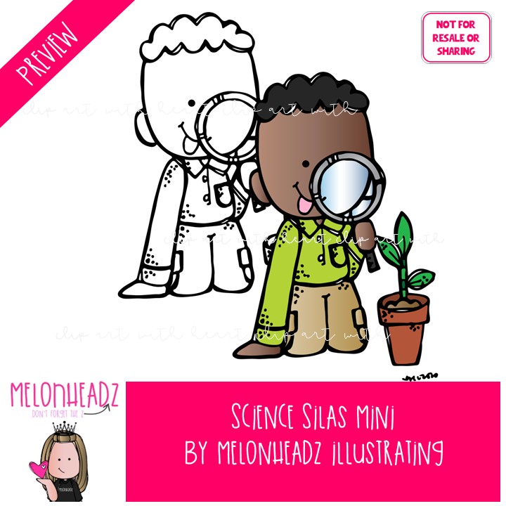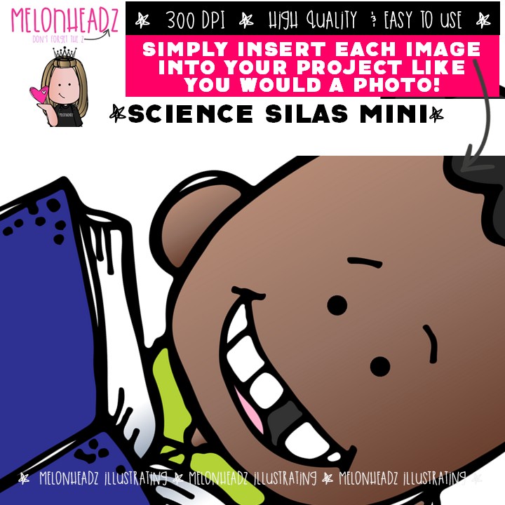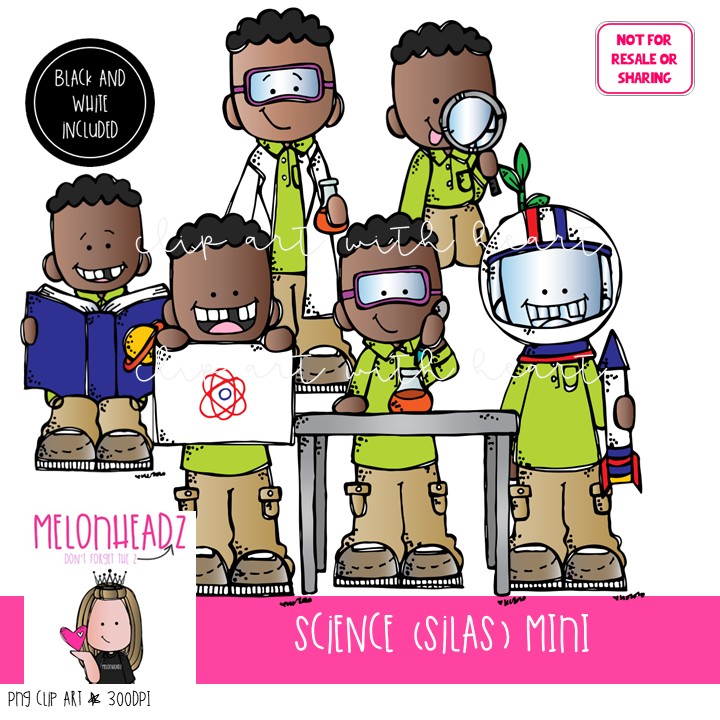 Science clip art, Silas, Melonheadz Character Mini: This illustrated set contains all of the clip art images as shown in the preview picture. COLORED and BLACK AND WHITE illustrations included.