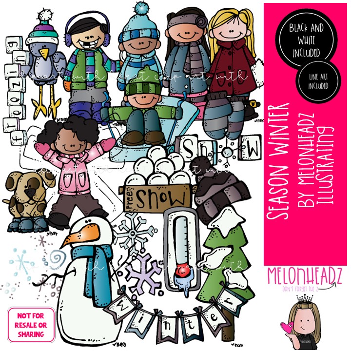 Season clip art, Winter clip art, snowflake clip art COMBO PACK: This illustrated set contains all of the clip art images as shown in the preview picture. COLORED, LINE ART and BLACK AND WHITE illustrations included.
