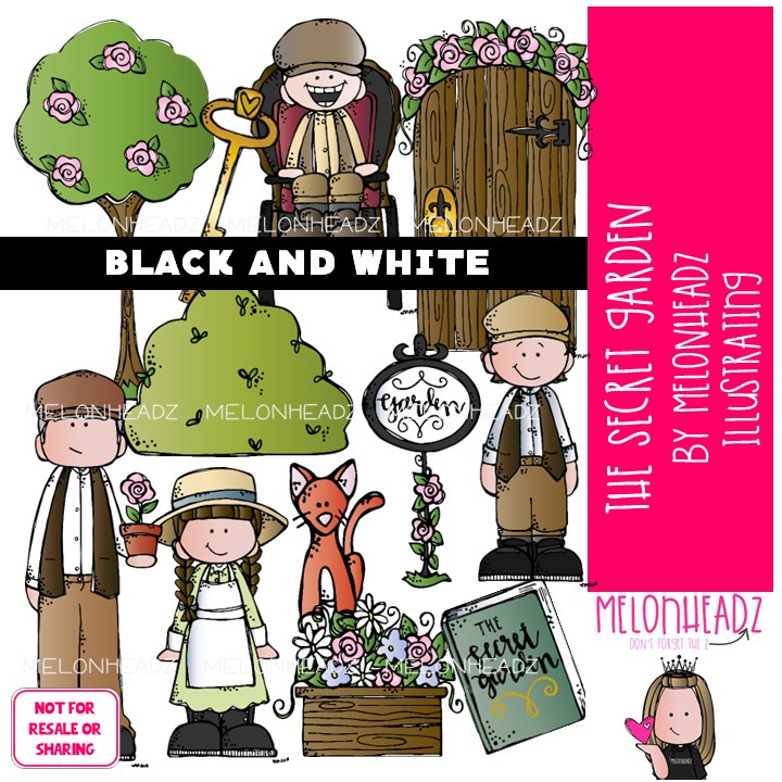 The Secret Garden clip art, literature, book companion, BLACK AND WHITE: This illustrated set contains all of the clip art images as shown in the preview picture. BLACK AND WHITE illustrations included.