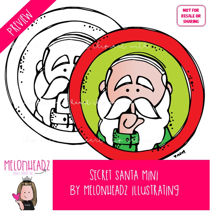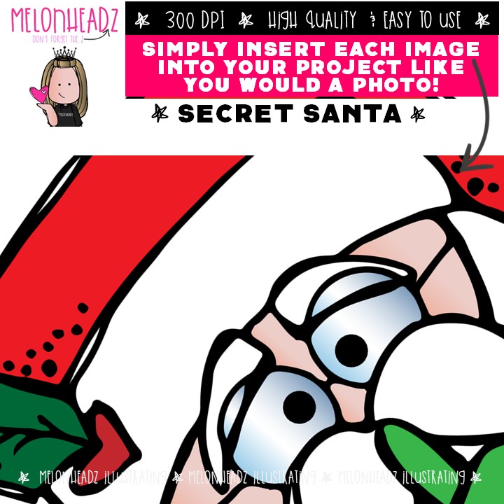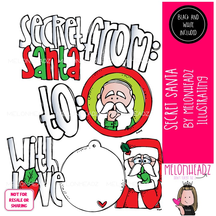 Secret Santa clip art, Christmas, Random acts of Kindness Mini: This illustrated set contains all of the clip art images as shown in the preview picture. COLORED and BLACK AND WHITE illustrations included.