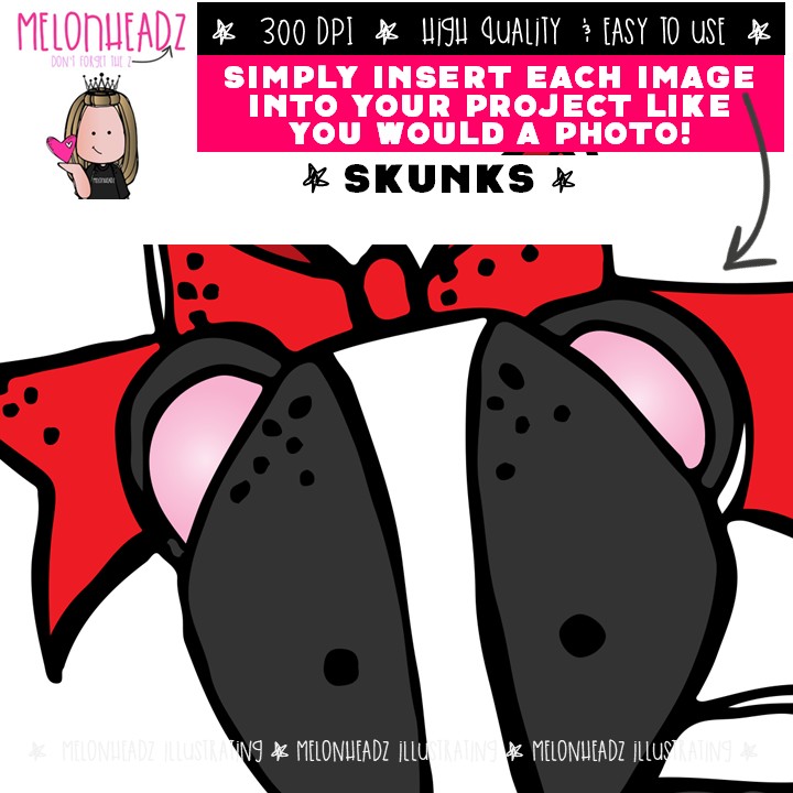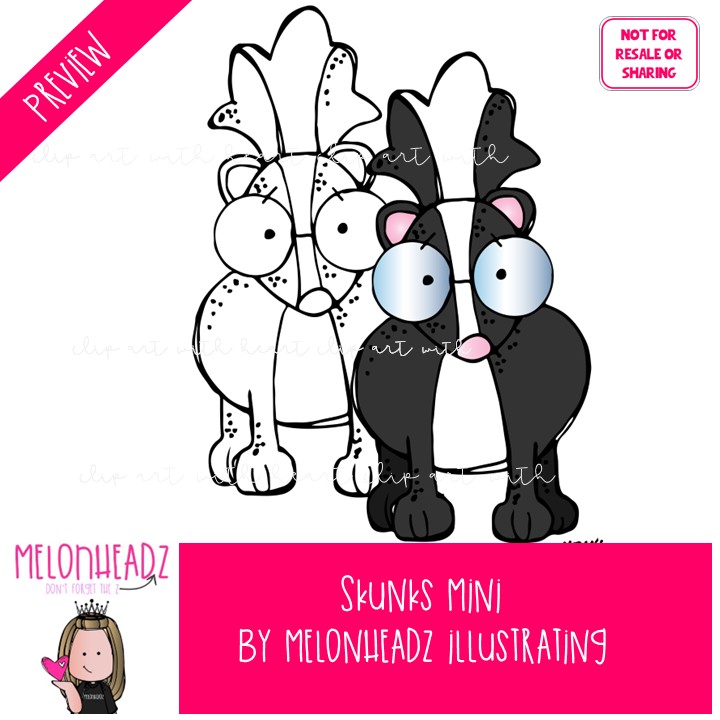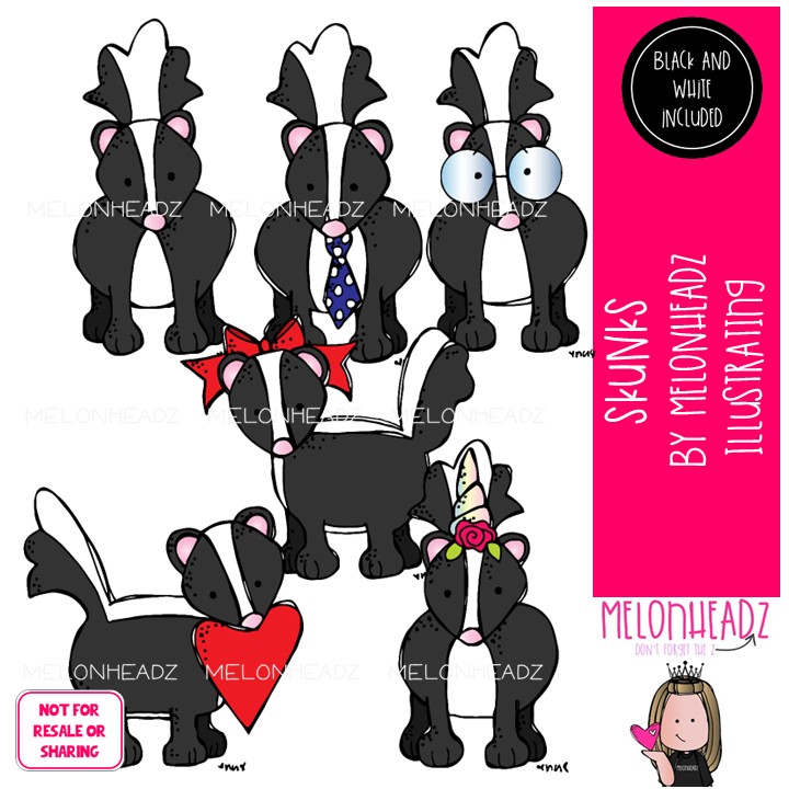 Skunk clip art, polecat Mini: This illustrated set contains all of the clip art images as shown in the preview picture. COLORED and BLACK AND WHITE illustrations included.