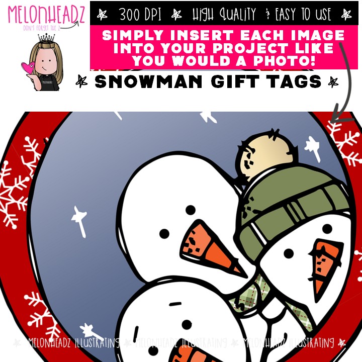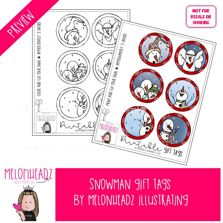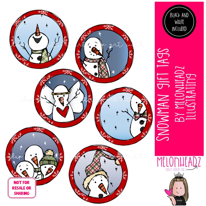 Snowman gift tags clip art, Printable, Christmas clip art, Winter clip art MINI: This illustrated set contains all of the clip art images as shown in the preview picture. COLORED  and BLACK AND WHITE illustrations included.