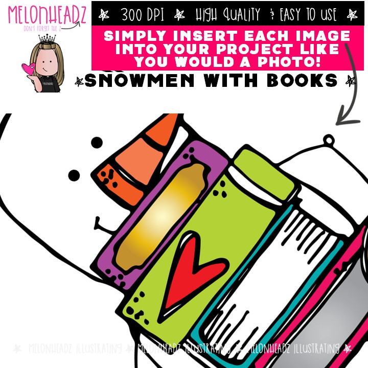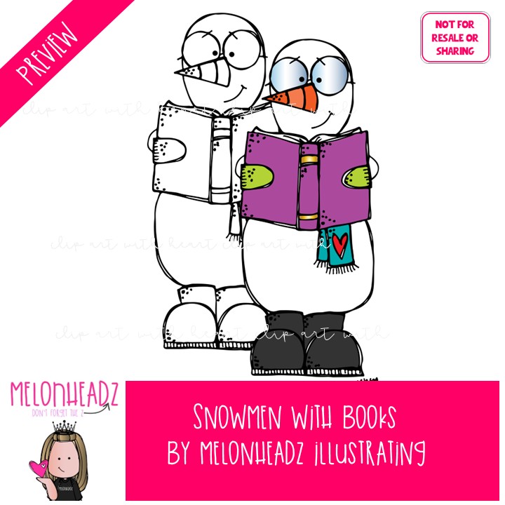 Snowmen with books clip art, Winter clip art Mini: This illustrated set contains all of the clip art images as shown in the preview picture. COLORED and BLACK AND WHITE  illustrations included.