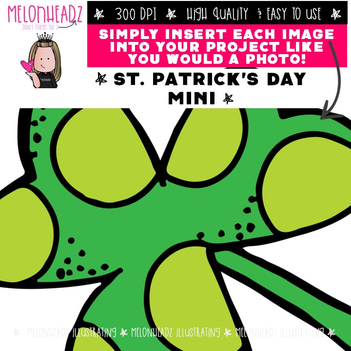 St. Patrick’s Day clip art, shamrock, rainbow Mini: This illustrated set contains all of the clip art images as shown in the preview picture. COLORED and BLACK AND WHITE illustrations included.