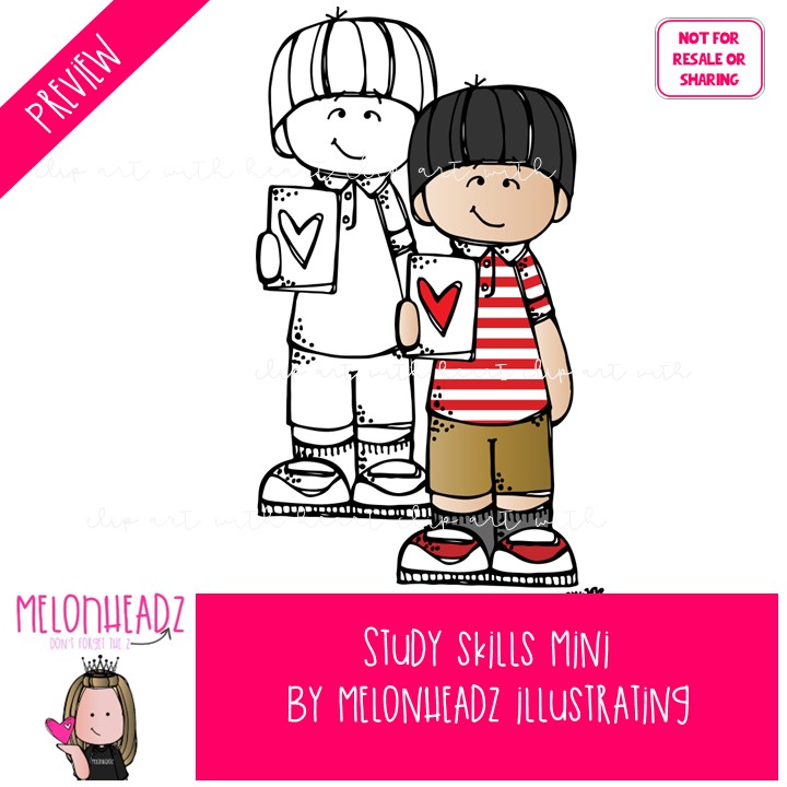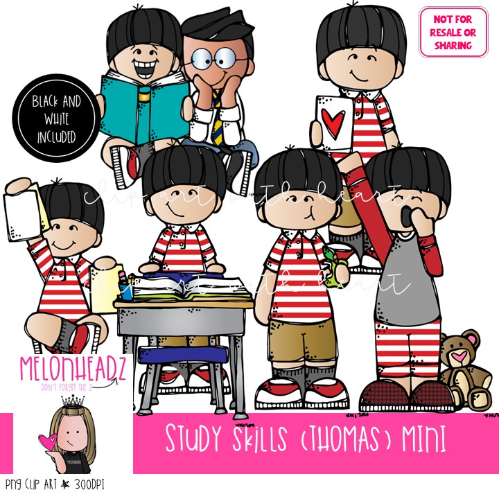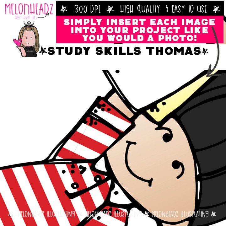 Study Skills clip art, Thomas, Melonheadz Character Mini: This illustrated set contains all of the clip art images as shown in the preview picture. COLORED and BLACK AND WHITE illustrations included.