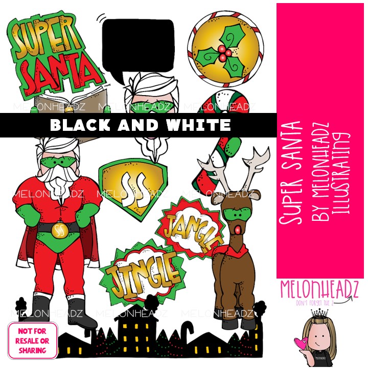 Super Santa clip art, Christmas clip art, Superhero clip art BLACK AND WHITE: This illustrated set contains all of the clip art images as shown in the preview picture. BLACK AND WHITE illustrations included.