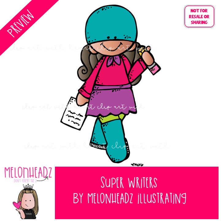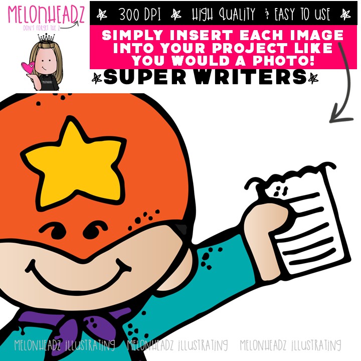 Super Writers clip art, Superhero clip art, Writers clip art COLORED Version: This illustrated set contains all of the clip art images as shown in the preview picture. COLORED illustrations included.