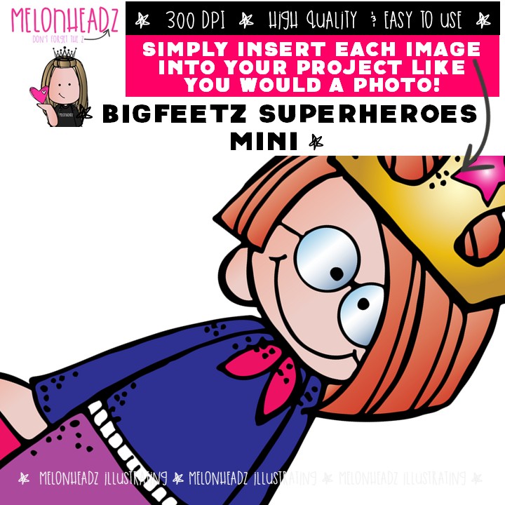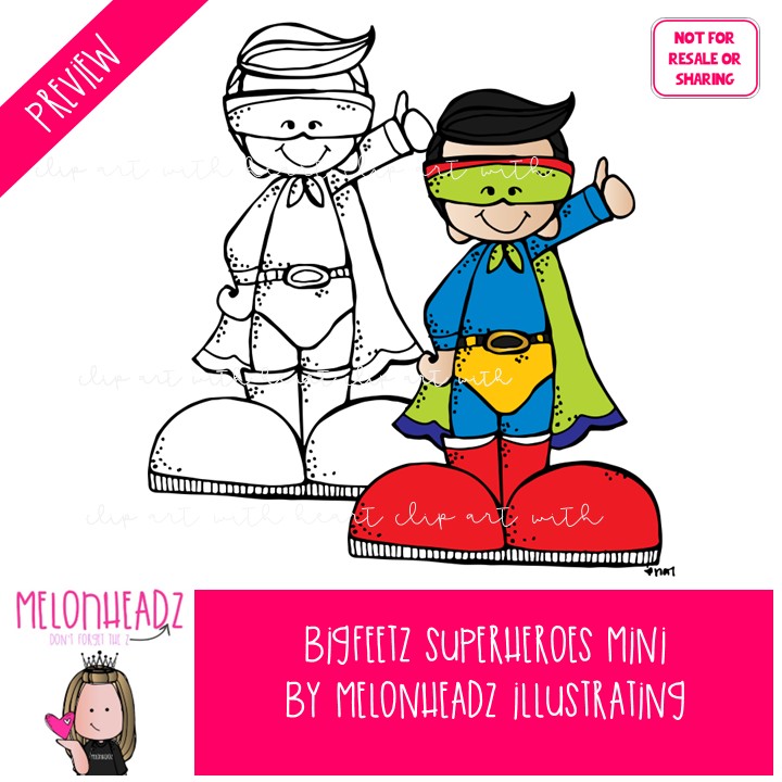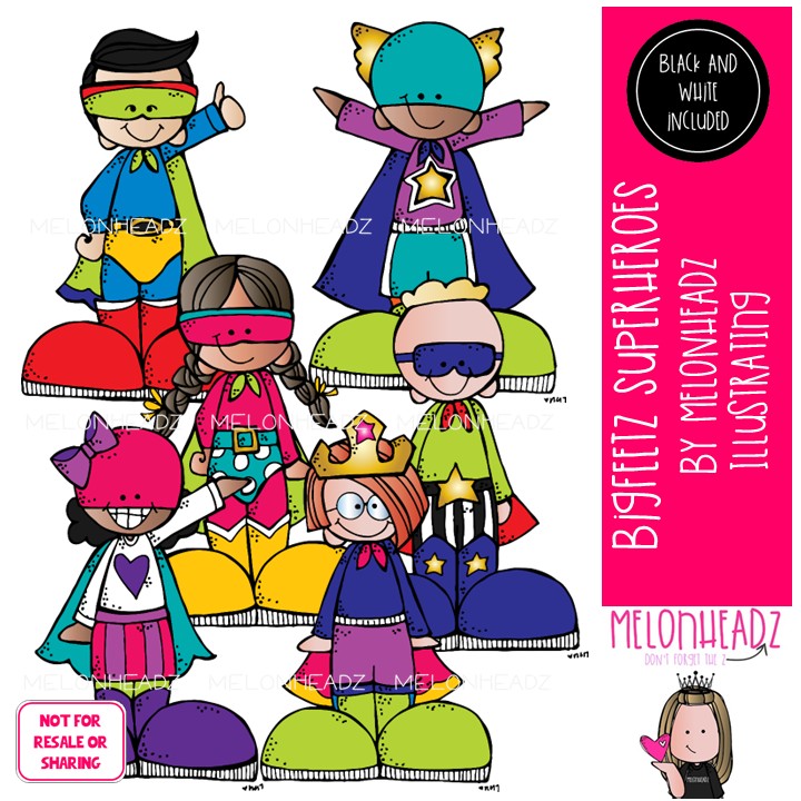 Bigfeetz clip art, Superheroes Mini: This illustrated set contains all of the clip art images as shown in the preview picture. COLORED and BLACK AND WHITE illustrations included.