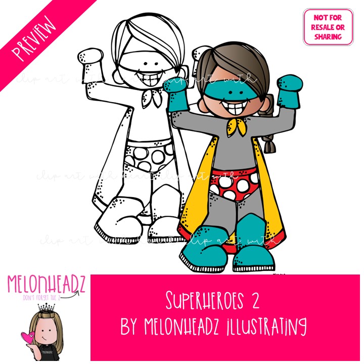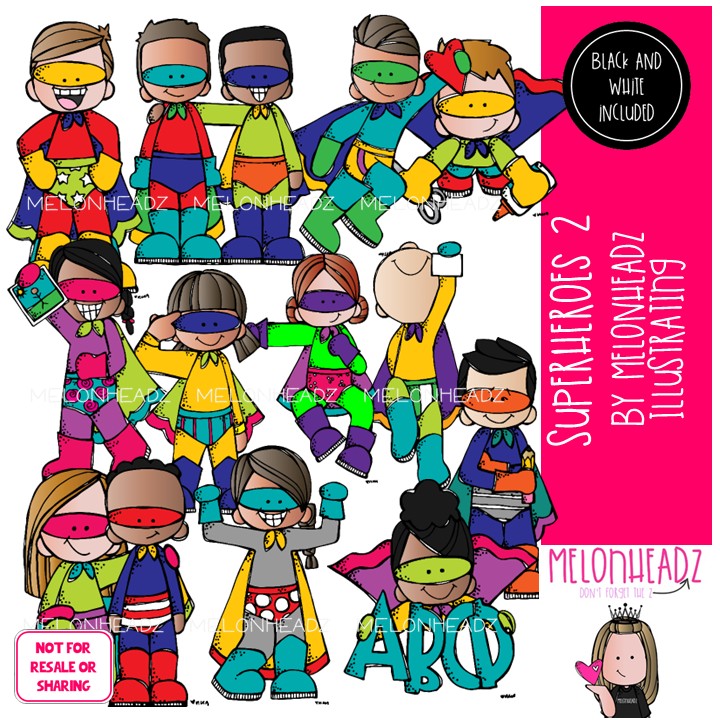 Superhero clip art Set 2 Superheroes clip art COMBO PACK: This illustrated set contains all of the clip art images as shown in the preview picture. COLORED and BLACK AND WHITE illustrations included.