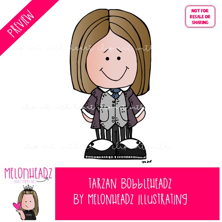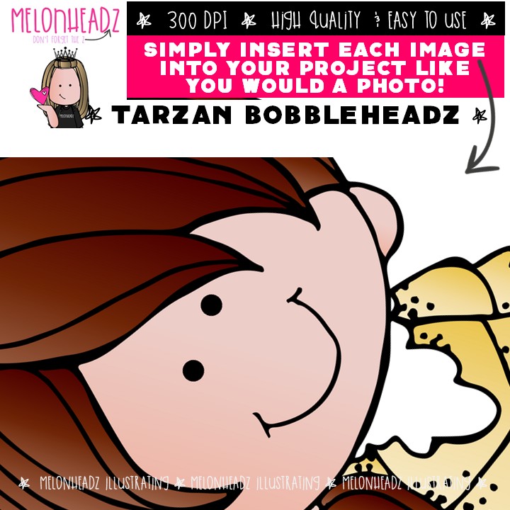 Tarzan clip art, Bobbleheadz, literature, book companion COLORED Version: This illustrated set contains all of the clip art images as shown in the preview picture. COLORED illustrations included.