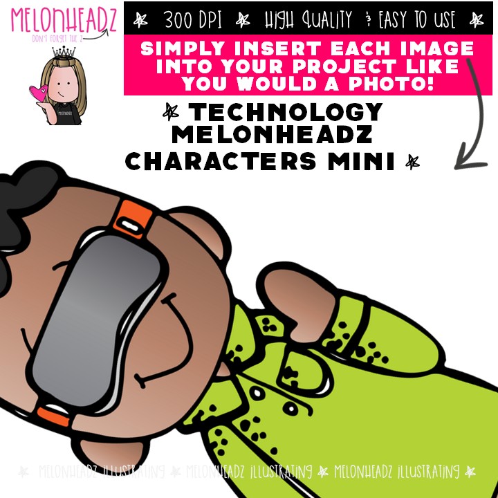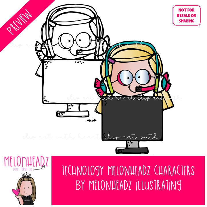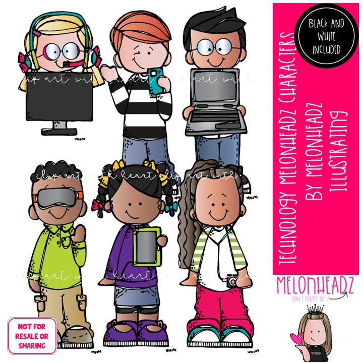 Technology clip art, Melonheadz Characters, laptop, tablet Mini: This illustrated set contains all of the clip art images as shown in the preview picture. COLORED and BLACK AND WHITE illustrations included.