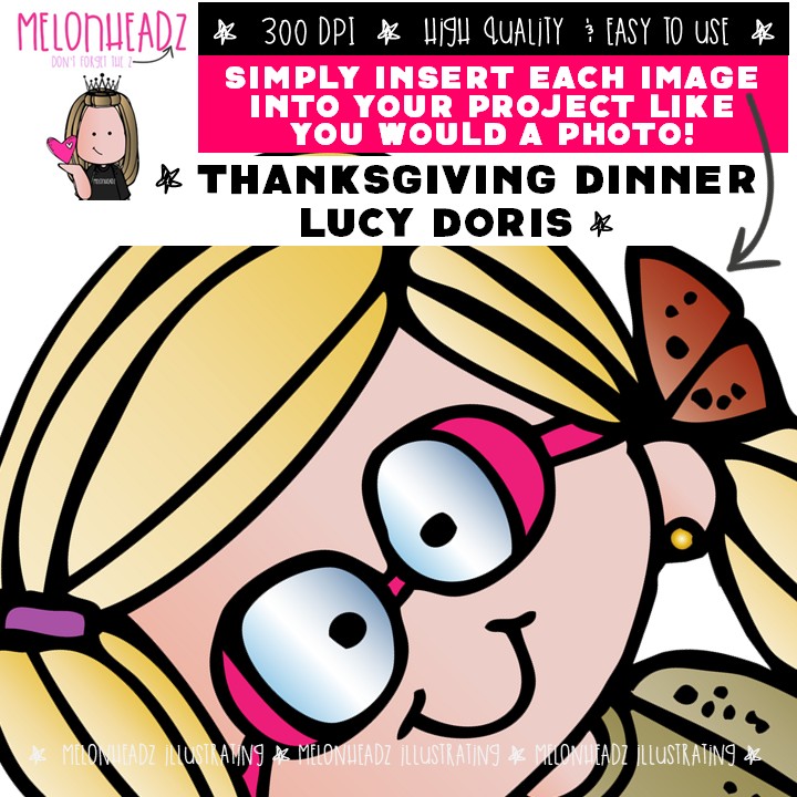 Thanksgiving Dinner clip art, Lucy Doris clip art COMBO PACK: This illustrated set contains all of the clip art images as shown in the preview picture. COLORED and BLACK AND WHITE illustrations included.