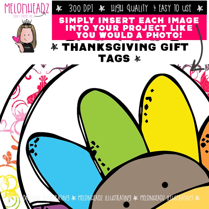 Thanksgiving gift tags clip art, turkey clip art, printable MINI: This illustrated set contains all of the clip art images as shown in the preview picture. COLORED and BLACK AND WHITE illustrations included.