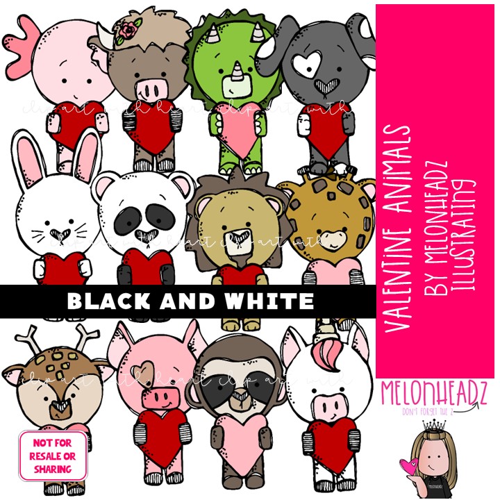 Valentine Animals clip art, Holiday clip art BLACK AND WHITE: This illustrated set contains all of the clip art images as shown in the preview picture. BLACK AND WHITE illustrations included.