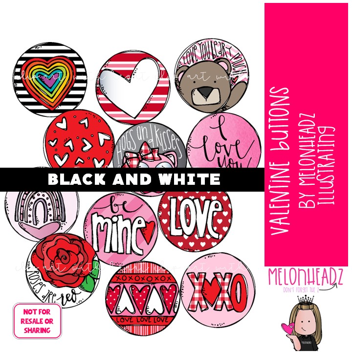Valentine Button clip art, Badge clip art BLACK AND WHITE: This illustrated set contains all of the clip art images as shown in the preview picture. BLACK AND WHITE illustrations only.