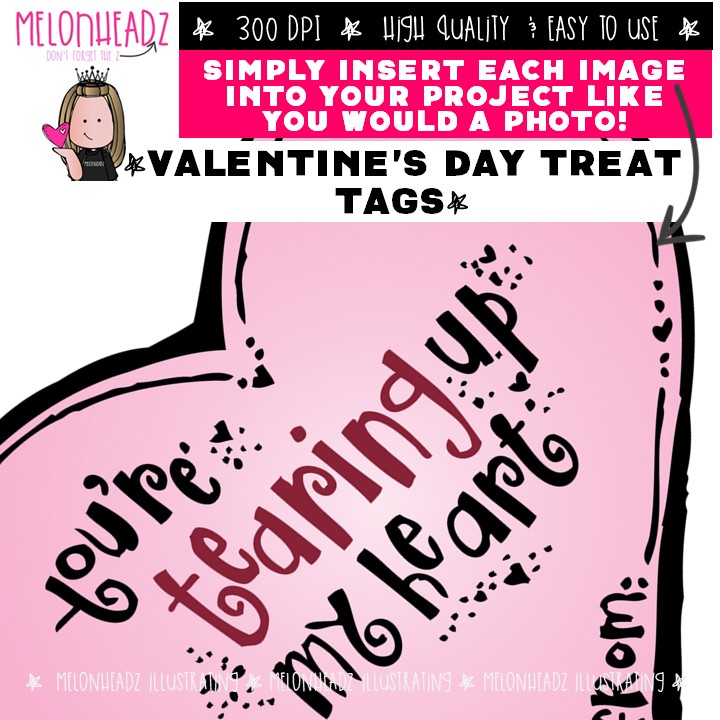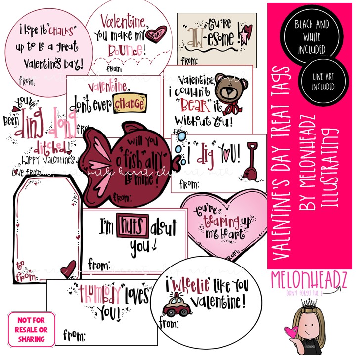 Valentine’s Day treat tags clip art COMBO PACK: This illustrated set contains all of the clip art images as shown in the preview picture. COLORED, LINE ART and BLACK AND WHITE illustrations included.