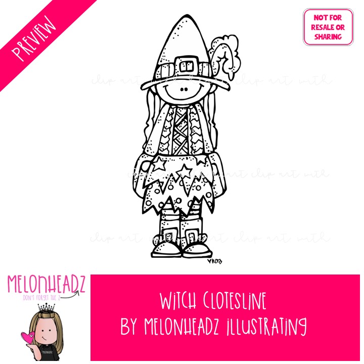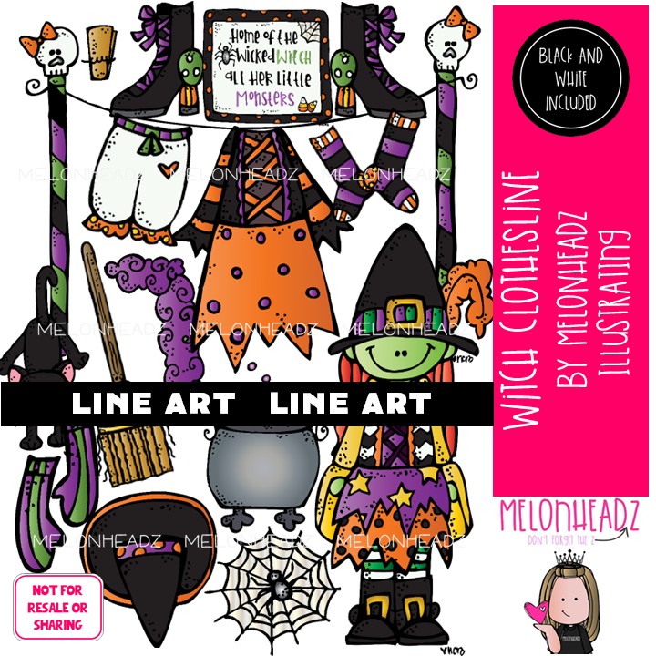 Witch Clothesline clip art, Halloween, clothing LINE ART and BLACK AND WHITE: This illustrated set contains all of the clip art images as shown in the preview picture. BLACK AND WHITE illustrations included.