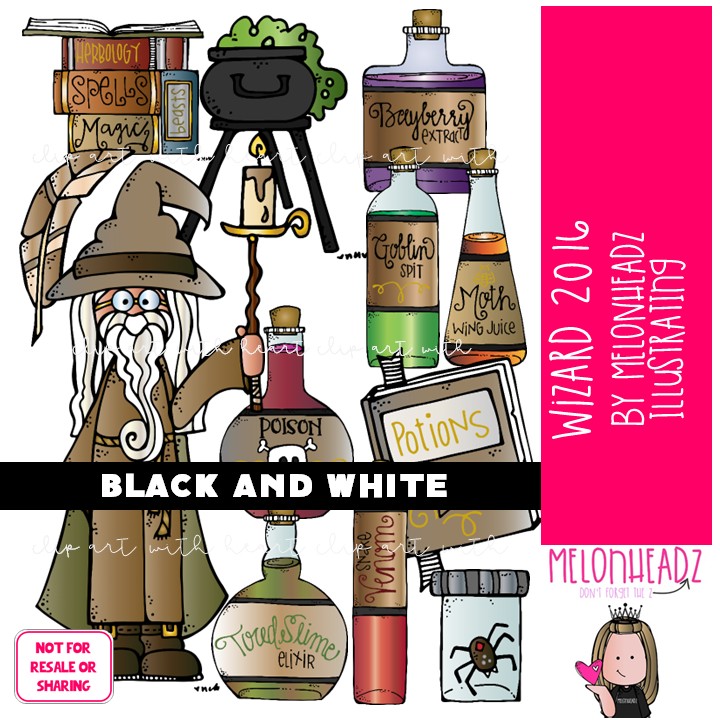 Wizard clip art 2016, potions, cauldron BLACK AND WHITE: This illustrated set contains all of the clip art images as shown in the preview picture. BLACK AND WHITE illustrations included.
