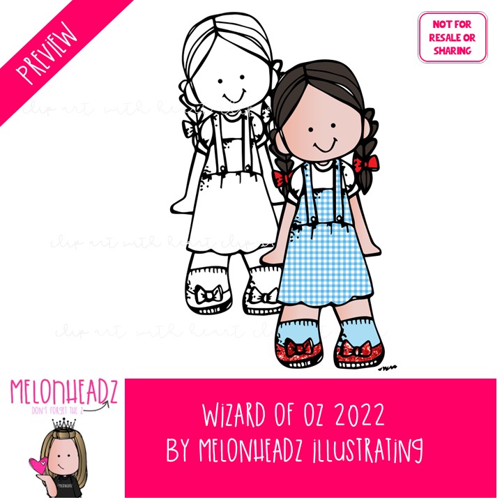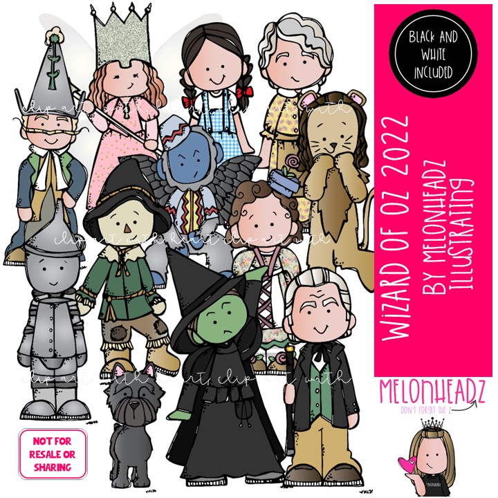 Wizard of Oz clip art 2022, literature, book companion COMBO PACK: This illustrated set contains all of the clip art images as shown in the preview picture. COLORED and BLACK AND WHITE illustrations included.