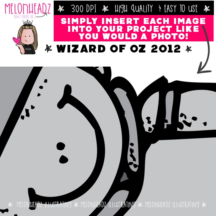Wizard of Oz clip art 2012, literature, book companion COMBO PACK: This illustrated set contains all of the clip art images as shown in the preview picture. COLORED, LINE ART and BLACK AND WHITE illustrations included.