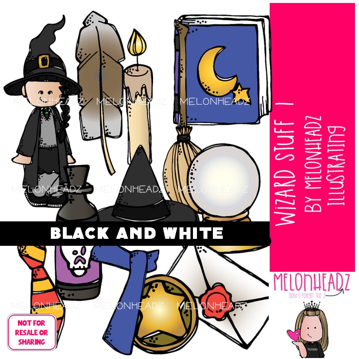 Wizard Stuff clip art 1, crystal ball, witch BLACK AND WHITE: This illustrated set contains all of the clip art images as shown in the preview picture. BLACK AND WHITE illustrations included.
