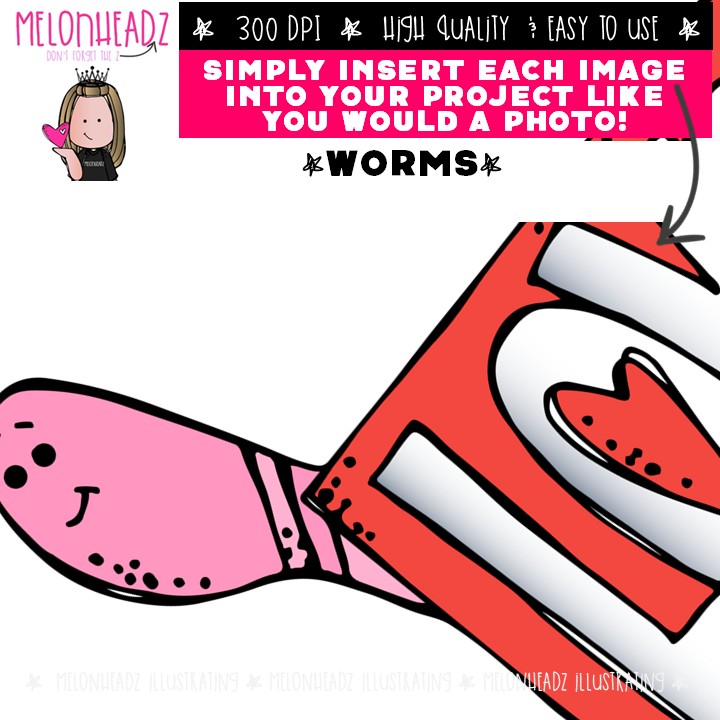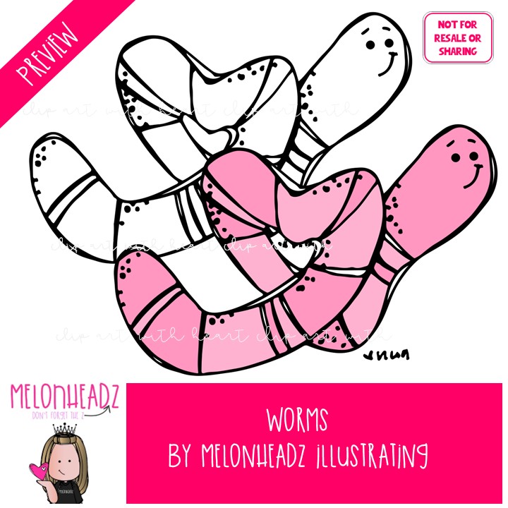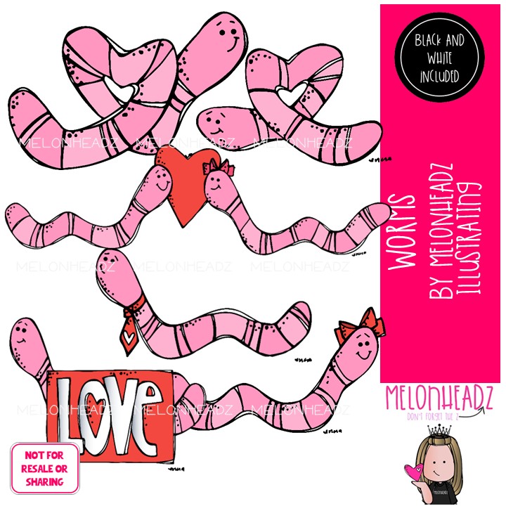 Worms clip art, Valentine’s Day clip art Mini: This illustrated set contains all of the clip art images as shown in the preview picture. COLORED and BLACK AND WHITE illustrations included.