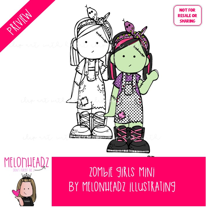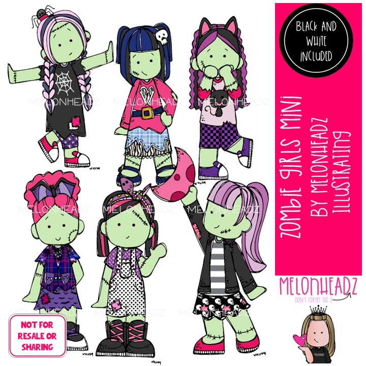 Zombie girls clip art Halloween clip art Costume clip art Mini: This illustrated set contains all of the clip art images as shown in the preview picture. COLORED and BLACK AND WHITE  illustrations included.